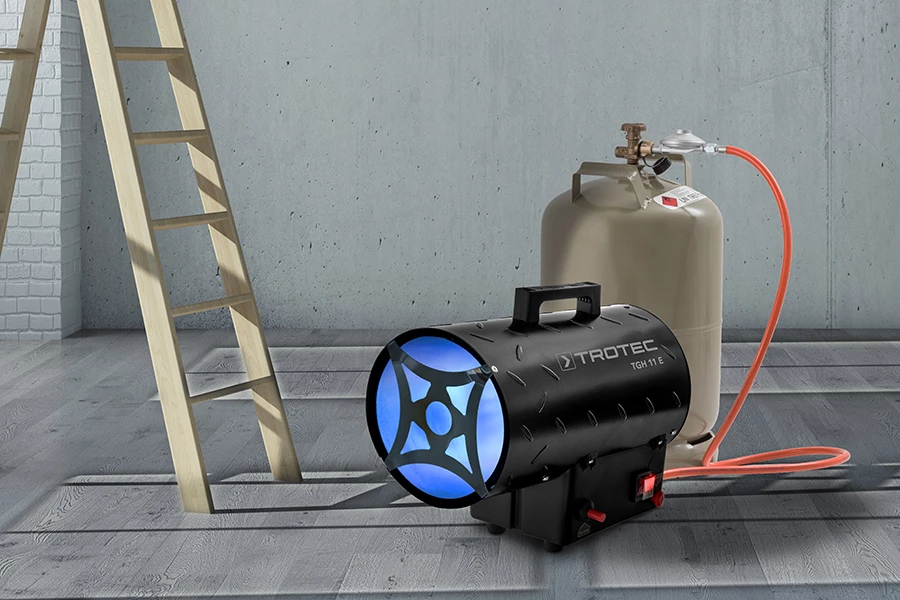 - Utilisez le chauffage au gaz TGH 11 E de 10 kW, par exemple, pour le chauffage mobile ponctuel de chantiers de construction bien ventilés, d’ateliers, de débarras, de garages, d’étables, de serres ou également pour les espaces extérieurs couverts, les tentes et les campings.